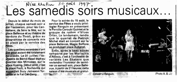 MUSIC ON SATURDAY NIGHTS Since the month of July there has been a possibility each Saturday night for the citizens of Le Cannet, Cannes, at Place Bellevue or at the Theatre of Verdure to celebrate thanks to the extraordinarily fine concert programme compiled by the festival commitee. Also the outskirts of the area have had the possibility: On the 31st of July theBernard Hasel Orchestra played in the Mimosa area at Place Koenig. In the beginning af August Suzy Jameson and Fat Cat Gang played at Place Foch in Rocheville. On the 15th of August the festival committee had the intension of pampering Ranguin by presenting the Pernilla Caroubi Quintet and the rhythm&blues group Ortax. On the following day the P. Michel Quartet played at Place Bellevue - and Magie Belfiore at Place Aubanel. Finally after the splendid koncert with Mariachis d'Atlixco, the music hall orchestra The Shakers will be dedicated to terminate this music season at Place Bellevue. |
