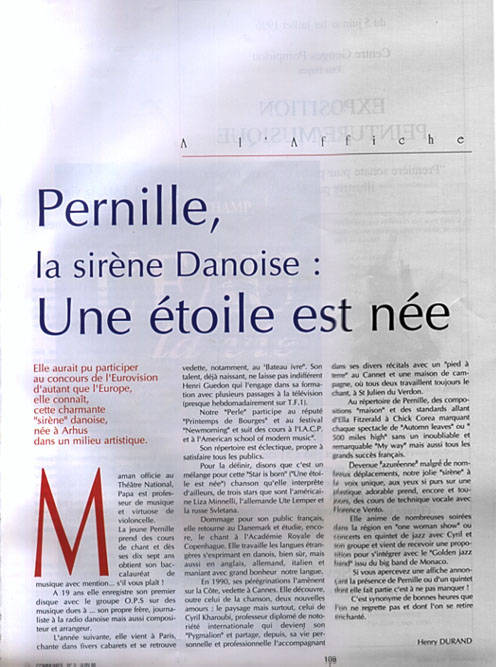 PERNILLE, THE DANISH SIREN VOICE: A STAR IS BORNBy Henry Durand She could have participated in the Eurovision Grand Prix since she is familiar with Central Europe as the charming Danish songbird who was born in Aarhus to an artistic background. Her mother was employed at the Theatre, and her father a music teacher and cellist. Pernille starts singing lessons at an early age. At the age of 19, she is a student of music and immediately she makes her first record with the group UPS, where the music was composed by her own brother. Apart from being an arranger and composer, he is full time employed as a journalist at the Danish Broadcasting Corporation. The following year brings her to Paris where she sings in cabarets, such as Le Bateau Ivre in Rue Mouffetard. In Paris, Henri Guedon becomes aware of her already budding talent and he engages her as a chorus girl with several contracts at wellknown concert halls and TV. Our "Treasure" performs at the festival Printemps de Bourges and the world-famous New Morning, and she continues her music studies at the American School of Music and IACP. Her repertoire is eclectic. She covers every style in order to satisfy a large public. In order to define this "Star is Born", (a song from her repertory) one might say that she is a mixture of the American Liza Minella, the German Ute Lemper, and the Russian Suletana. The Frenchmen only deplore that she often goes back to Denmark where she takes classical vocal training with professors from Danish conservatories, In order to define this "Star is Born", (a song from her repertory) one might say that she is a mixture of the American Liza Minella, the German Ute Lemper, and the Russian Suletana. The Frenchmen only deplore that she often goes back to Denmark where she takes classical vocal training with professors from Danish conservatories, among others the opera singer Lars Waage. Pernille works in several languages, of course Danish, but also in English, German, and to our satisfaction, in our own language, French. In 1990, her travelling abroad takes her to the French Cote d'Azur, more explicitly to Cannes. Apart from her singing, she falls in love twice, - with the scenery - and especially with a jazz pianist, Cyril Caroubi, who becomes her Pygmalion. From now on, they share both their personal and professional life by performing widely over the south of France. Today, they reside in Le Cannet and have a house in the country where they practice. Pernille's repertoire covers both her own compositions and songs, as well as standards all the way from Ella Fitzgerald to Chick Corea. Especially thrilling is her version of "Autumn Leaves" or "500 Miles High", not to mention her notorious interpretations of "My Way" or all the other great French success-songs. In spite of her many travels, our songbird has grown into an Azur southener, with her exceptional voice, with eyes so bright, and a face so beautiful. She continues to make singing lessons at Florence Vento, Nice, in order to maintain her skills. She often gives herself in One Man Shows along the Cote d'Azur, or she gives concerts with her husband's jazz band orchestra. Recently she has made contract with Golden Jazz Band, a bigband based in Monaco. During many years she has also travelled all over France with the large big band Exclusif from Nice. If you notice a poster with Pernille's name, then this is a chance that you should not miss. An evening with her is equivalent to exhilarating experience that you will never regret. You will leave the concert elevated. |